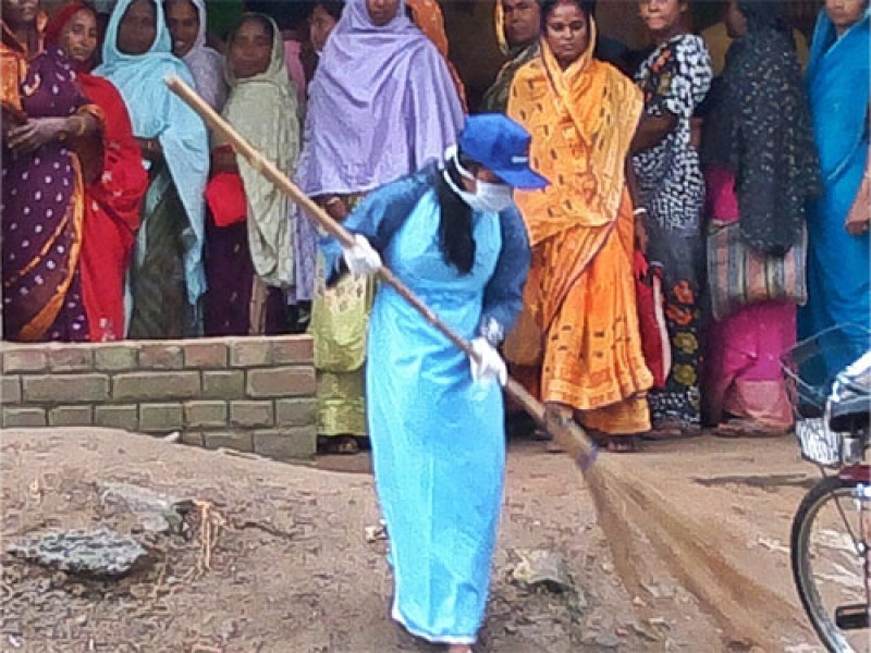 A grass-root advocate cleaning the mess outside the dispensary of Sargachi clinic.