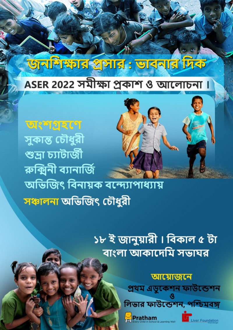 Seminar on ‘Jana Shikshar Prasar: Bhabnar Dik’ dated 18th January 2023 The ASER 2022 conducted by Pratham Education Foundation assessed the performance of children aged 3 to 16 in basic reading and arithmetic tasks. The release of a book titled 'কোভিড পরবর্তী বুনিয়াদী শিক্ষার পুর্নগঠন – পরিস্থিতি ও উত্তরণের পথ' during the event aimed to provide solutions for improving education amid the pandemic.